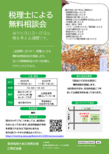 令和7年11月8日(土)と11月11日(火)の2日間「税理士による無料相談会」を実施します。